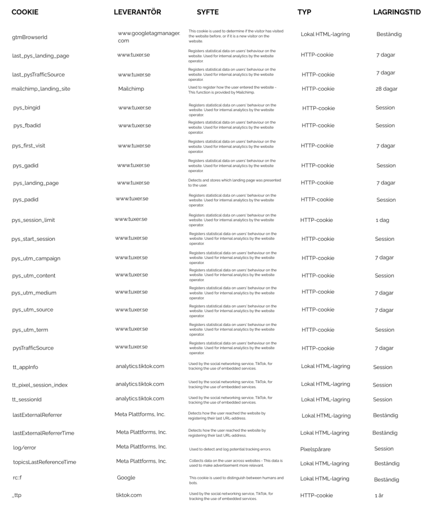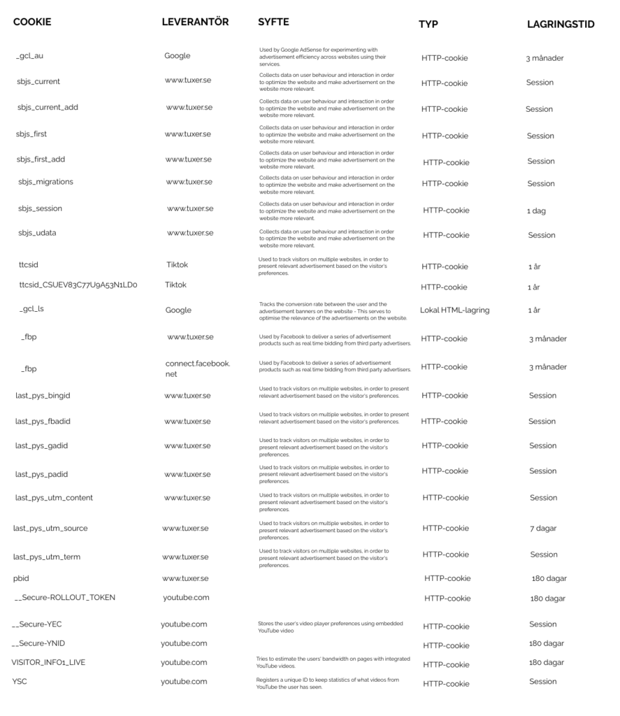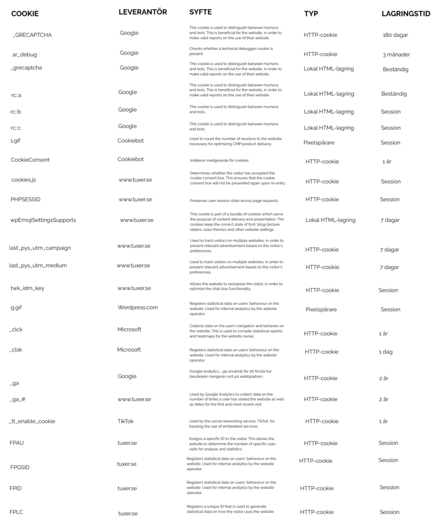 På Tuxer.se använder vi cookies och liknande tekniker för att säkerställa att webbplatsen fungerar korrekt, förbättra din användarupplevelse samt analysera hur vår webbplats används. I denna policy förklarar vi vilka cookies vi använder, varför vi använder dem och vilka val du som besökare har.