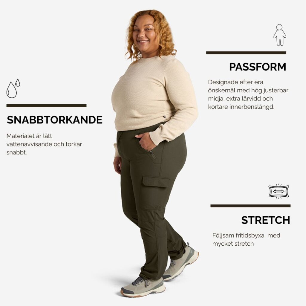 Välj en sval fritidsbyxa för sommarens utomhusaktiviteter. Det är extra viktigt att byxan är stretchig, snabbtorkande och att de inte är för tjocka. Vår byxa Evie är en uppskattad fritidsbyxa som finns i stora storlekar. En bekväm fritidsbyxa för alla utomhusaktiviteter, exempelvis trädgården, vandringen och hundpromenaden.