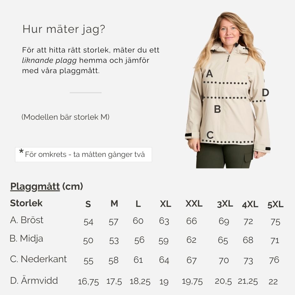 Lägg din jacka plant, mät rakt över, och jämför med måtten nedan.