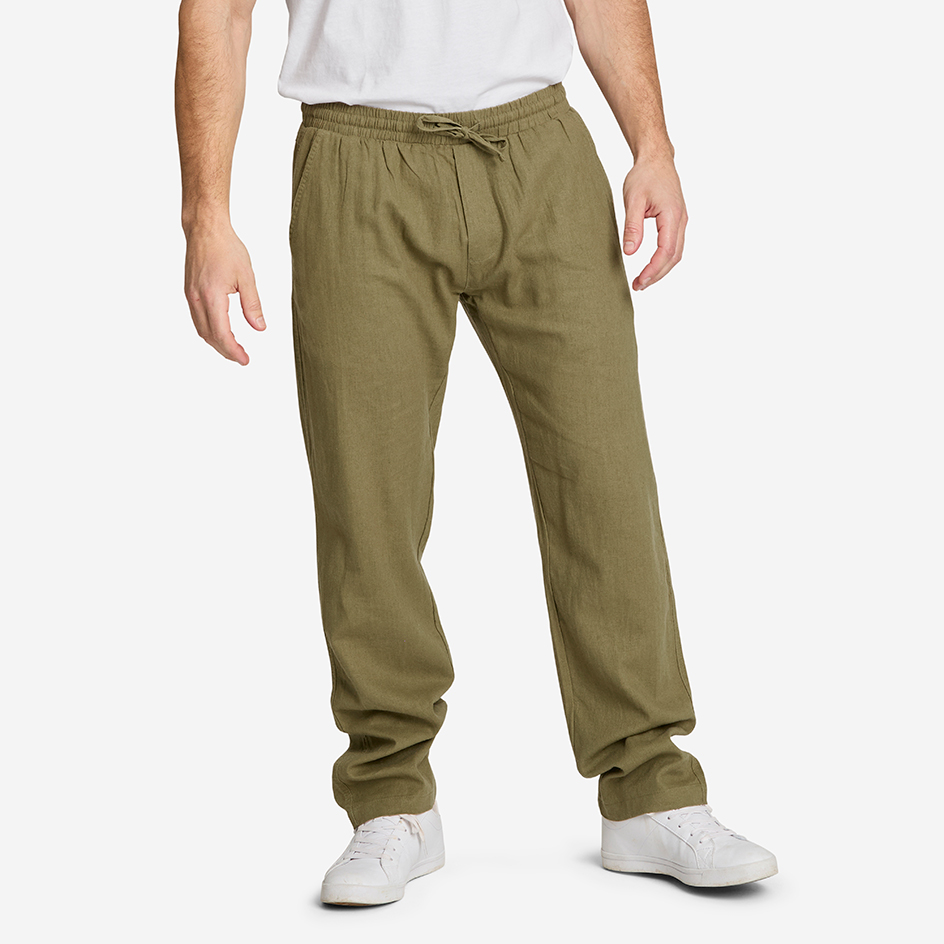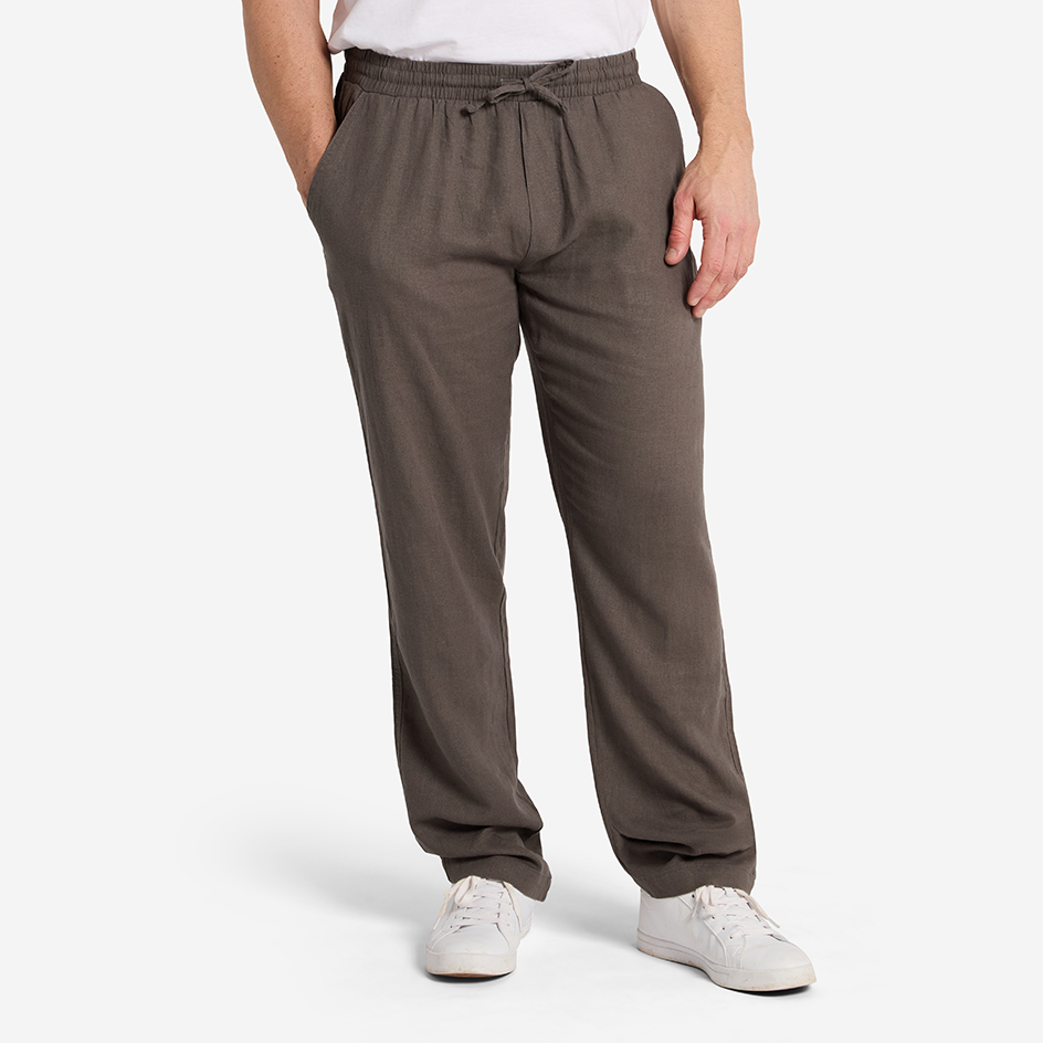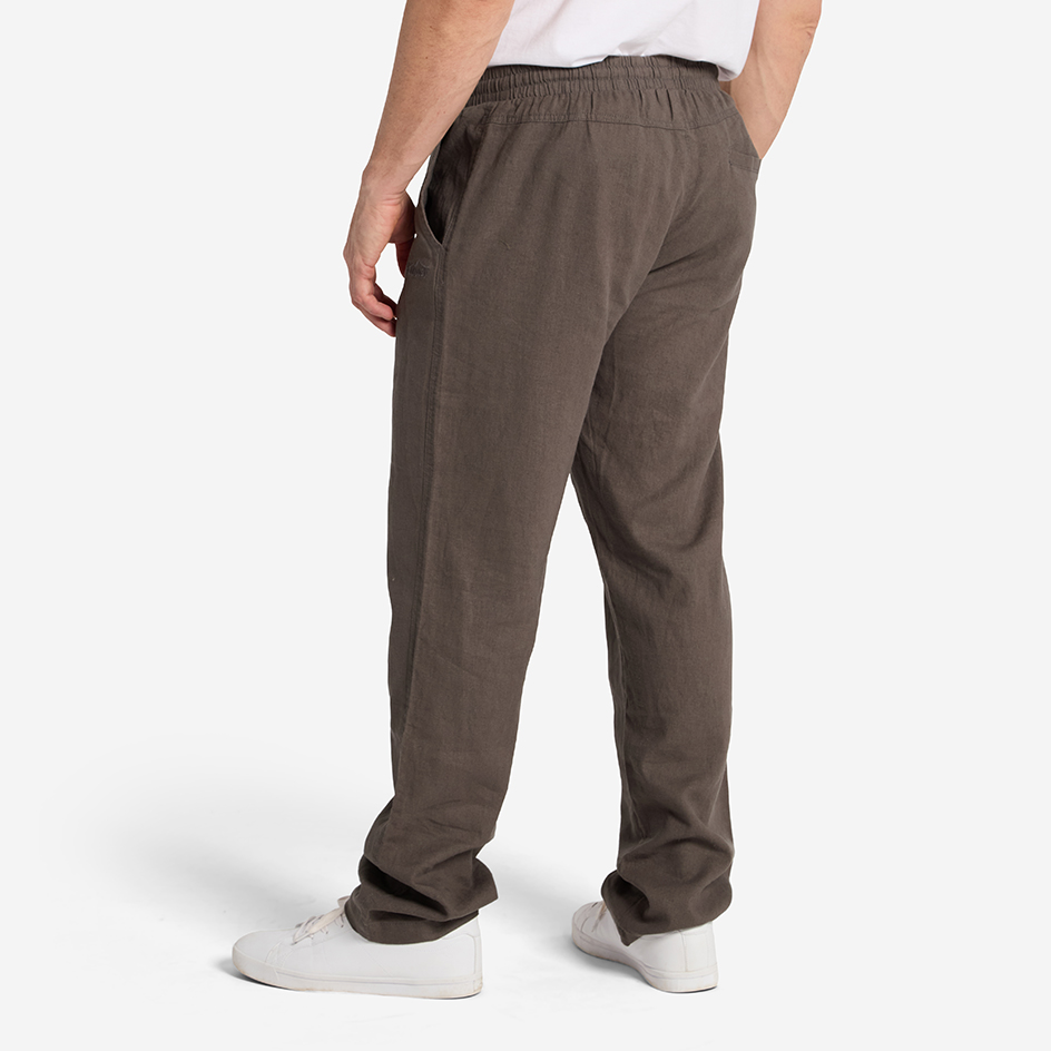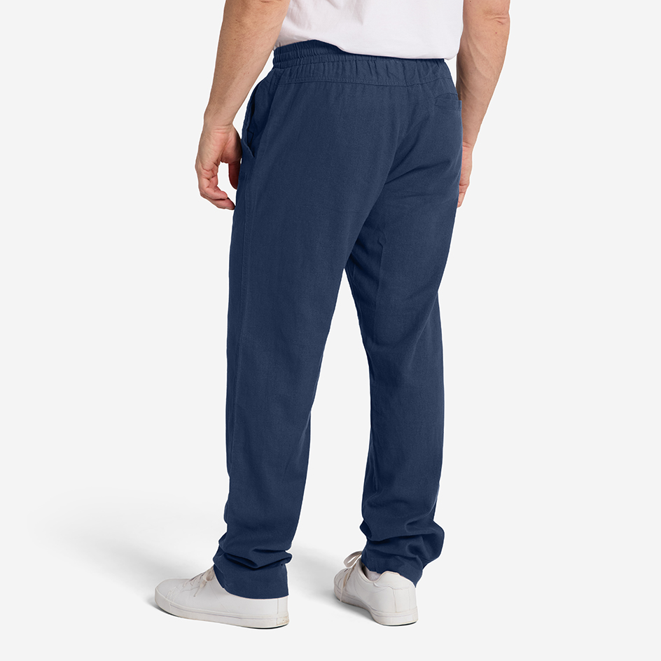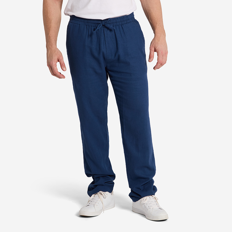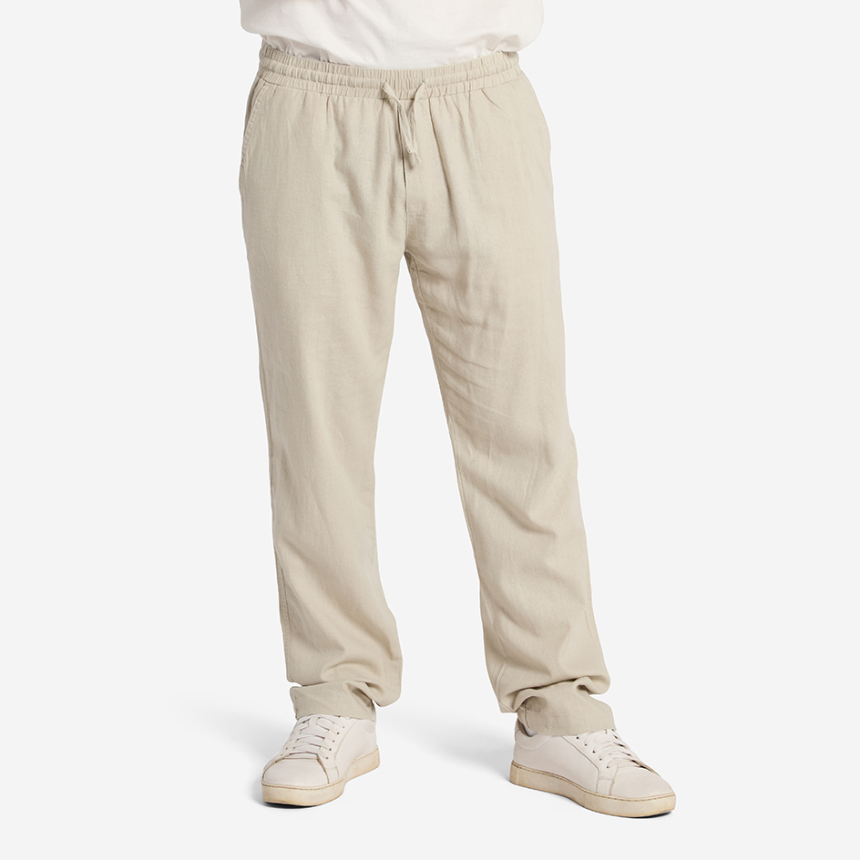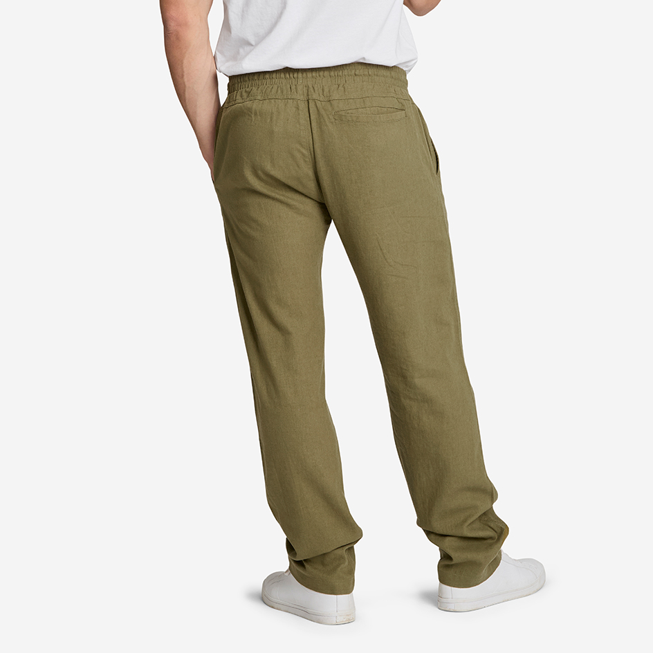Egenskaper: Casual linnebyxor med ledig passform tillverkade i 55% linne och 45% rayon, vilket ger en mjuk och svalkande känsla. De finns i tre klassiska färger – beige, dark navy och olivgrön. Modellen har resår och en dragsko i midjan för en bekväm passform, samt flera fickor – två på sidorna och en bakficka.