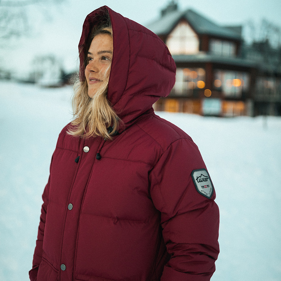 Dunjacka har en modell som liknar en pufferjacka, stoppad med tjockt och ansvarsfullt dun som håller värmen när temperaturen sjunker. Denna varma jacka har både vind- och vattenavvisande egenskaper som garanterat håller dig både varm och torr på vinters kalla dagar. Plagget är utrustat med en huva med en dragsko som regleras utifrån vind och snöyra. De stora och varma fickorna har plats för både dina frusna händerna och värdesaker. För att synas i höstmörkret har vi utrustat denna vinterjacka med reflex på dragskon.